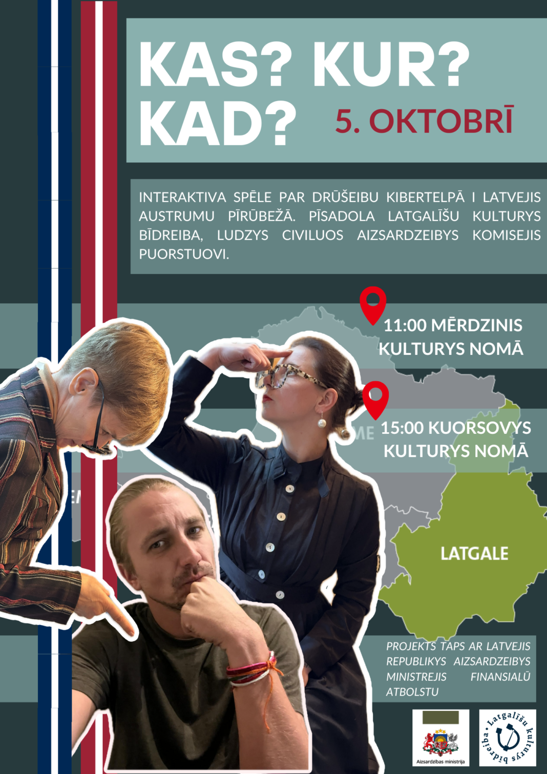 Nu 5. oktobra da 14. decembra Kruoslovys i Ludzys nūvodu pīrūbežā, kai ari vysmoz sešūs Rēzeknis nūvoda pogostūs gasteis Latgalīšu kulturys bīdreibys (LKB) i attīceiguos pošvaļdeibys puorstuovi, stuostūt par drūšeibu, vyltus ziņom, leluokūs mitus, civiluos aizsardzeibys i kiberdrūšeibys aktualitatem, nūskaidrojūt pamatvaicuojumus interaktivā spēlē “Kas? Kur? Kod?”. Informaceja byus socialajūs teiklūs, pošvaļdeibuos i pa vacai mūdei – iz afišu stobim.